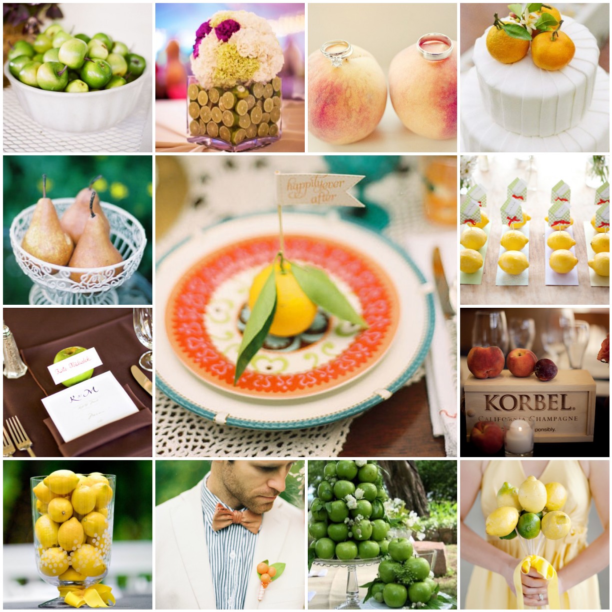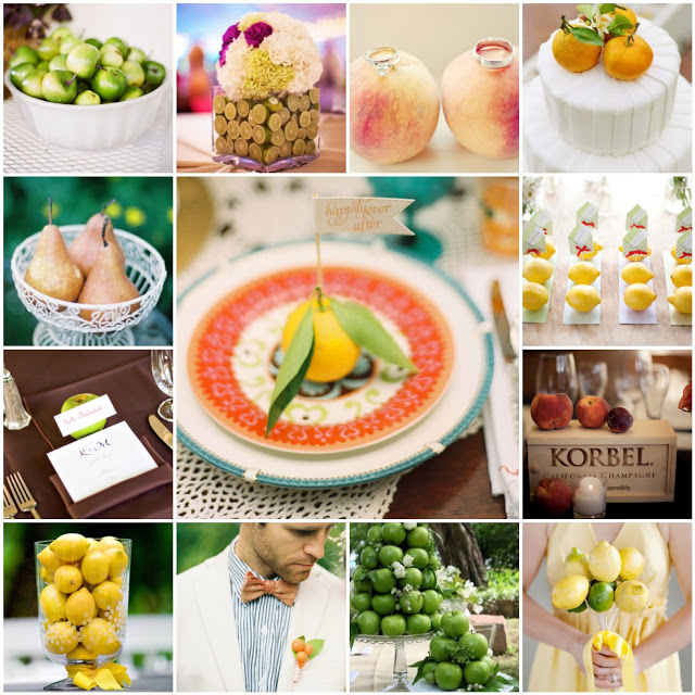 There's no getting around it, flowers are expensive. And I mean, really expensive. The problem is that most brides think that they can't get away without having flowers everywhere: at the ceremony, the centerpieces, even the bouquets. But, they can get away with it! How, you ask? With fruit, of course! It may sound weird, but fruit makes for beautiful arrangements. They work for centerpieces, name cards, place settings, virtually anywhere that you would normally have flowers. As you can see, I've shown examples for oranges, limes, lemons, pears, apples, and peaches. But, the possibilities are endless. Pineapples would work great for a tropical wedding. Grapes would work for a vineyard wedding. You've just got to not be afraid of trying something new and fresh.
