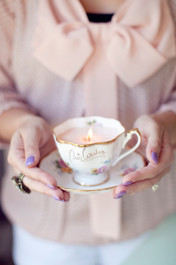 {Step 4} Now you get to wait. So go grab some ice cream, hang out for a bit and let the wax completely dry. I’d say give it a few hours at least before you try to trim your wicks or light your candles. Once the wax looks cloudy, smooth and is hard to the touch (like an ordinary candle you’d light in your home) you’ll know the wax is dry. Using very sharp scissors, cut your wick directly at the wooden skewer clamp and gently pull the wooden skewers away from the wick. Then you can light your beautiful new Vintage Teacup Candles! This was by far the best part.