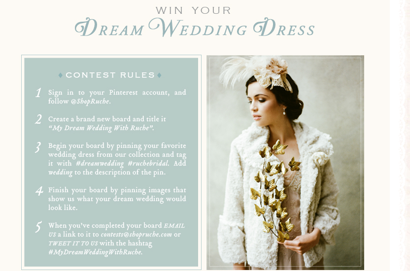 So, if you need more convincing to enter (you would be absolutely crazy if that was the case), then let me tell you HOW you enter. Trust me, you're going to love it. All you have to do is get on Pinterest (fun!) and make a board featuring your "dream wedding" (more fun!). Pin pictures from any and all websites, but be sure to include at least 4 images from the Ruche website including a Ruche gown! (You may pin images from the Ruche site and from their bridal page here: http://shopruche.com/bridal/mediashare.html).