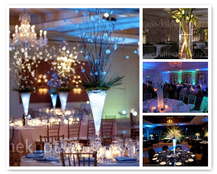 Finally, after much searching, I think I've got it: light up centerpieces! Sounds trashy, right? I don't want my reception looking like Showgirls III, for obvious reasons. Luckily, I've found some pictures that I think look up-scale and fun, without any of the sleeze. So here they are. What do you think?
